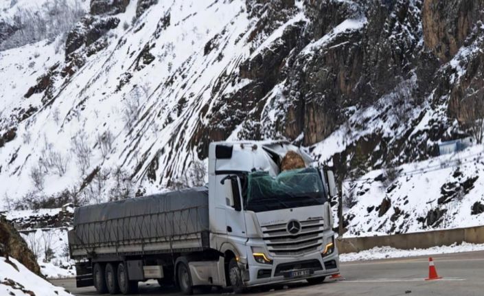Gümüşhane-Kürtün karayolunda seyir halindeki tırın üzerine dev kaya düştü, olayda sürücü yaralandı.