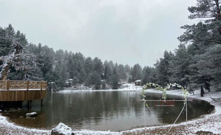 Denizden 2 bin 24 metre yükseklikteki Limni Gölü Tabiat Parkında sabaha karşı gerçekleşen hafif kar yağışının ardından göl ve etrafındaki ağaçlar beyaz örtüyle bezenirken ortaya seyrine doyumsuz manzaralar çıktı.