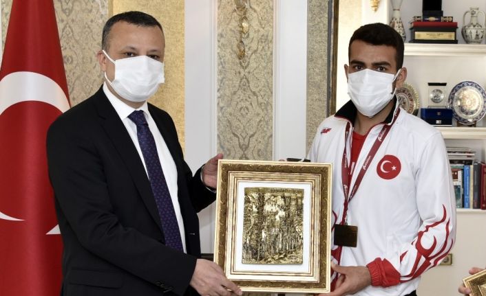 Gümüşhane Valisi Kamuran Taşbilek, ilk defa katıldığı Balkan Şampiyonasında birinci olarak İstiklal Marşını okutan Gümüşhaneli koşucu Abdullah Çakır’ı makamında kabul etti.
