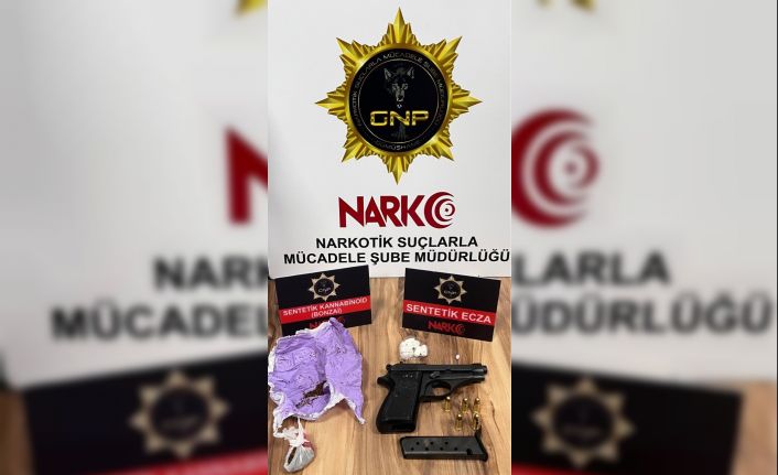 Gümüşhane Cumhuriyet Başsavcılığı koordinesinde yapılan aramada 7 gram tütün ile karıştırılmış Sentetik Kannabinoid (Bonzai) maddesi, 9 adet sentetik ecza ile 1 adet ruhsatsız tabanca ve bu tabancaya ait 5 adet 7,65 mm çapında fişek ele geçirildi.