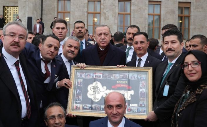 Teknikerler ve Yüksek Teknikerler Derneği (TEKDER) tarafından Cumhurbaşkanı Recep Tayyip Erdoğan’a Türkiye Büyük Millet Meclisi’nde (TBMM) grup toplantısı çıkışında altın anahtar işlemeli tablo hediye etti.