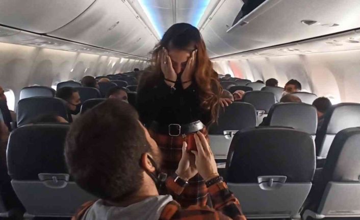 Ankara’da özel bir TV kanalında görev yapan kameraman, kız arkadaşına 11 bin metre yükseklikte uçakta evlilik teklifi yaptı.
