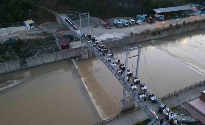 Rize’nin Çayeli ilçesine bağlı Muradiye Beldesinde bu yıl 9. kez düzenlenen Geleneksel Asma Köprü Yemeği’nde yapılan 15 Temmuz Demokrasi Köprüsü’nün minyatüründe yaklaşık 500 kişi iftar yaptı.