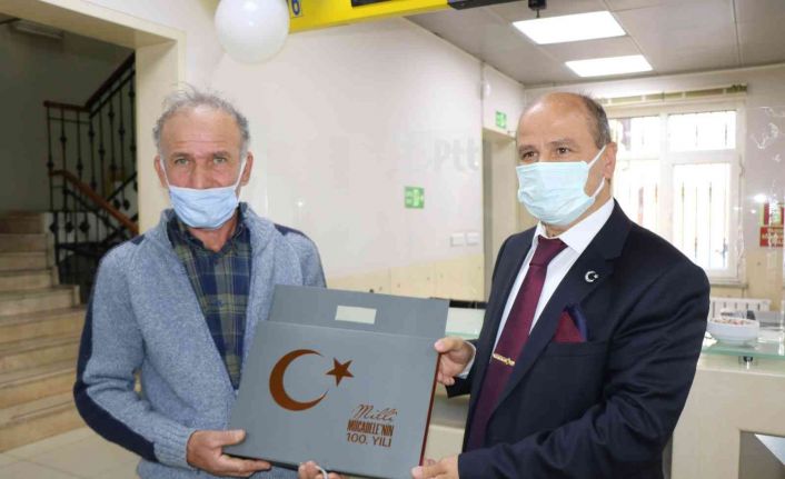 SAMSUN (İHA) – Samsun’da PTT’nin 181. kuruluş yıldönümü dolayısıyla 181. müşteriye içerisinde ilk gün zarfı ve filatelik pulların yer aldığı katalog hediye edildi.