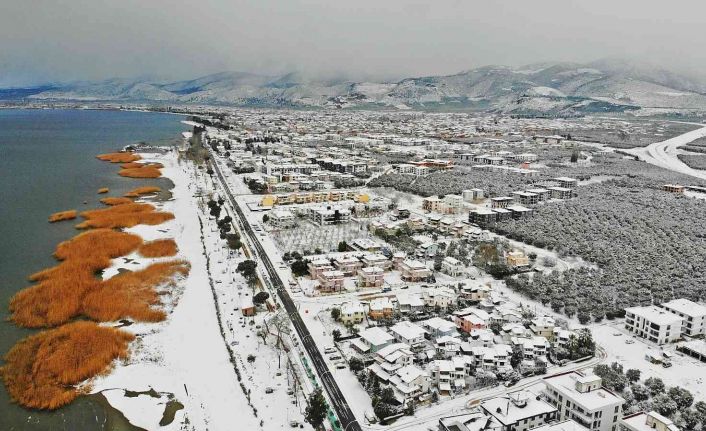 Marmara Bölgesi’ni etkisi altına alan kar yağışı Bursa’nın İznik ilçesinde kartpostallık manzaralar oluşturdu. Karlar altındaki 2 bin yıllık antik şehir, havadan görüntülendi.