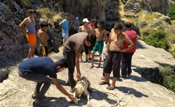 Şanlıurfa’nın Bozova ilçesinde Fırat Nehrinin kıyısında bulunan yaklaşık 20 metre derinliğindeki sarnıca düşen köpek halatla kurtarıldı.