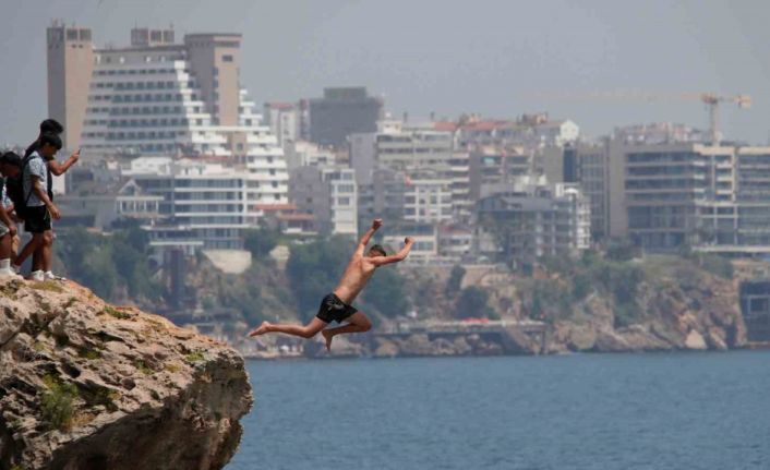 Antalya’nın Konyaaltı Sahili’nde adrenalin tutkunu gençlerin 30 metre yüksekliğindeki falezlerden denize yaptıkları tehlikeli atlayış izleyenlerin yüreklerini ağzına getirdi.