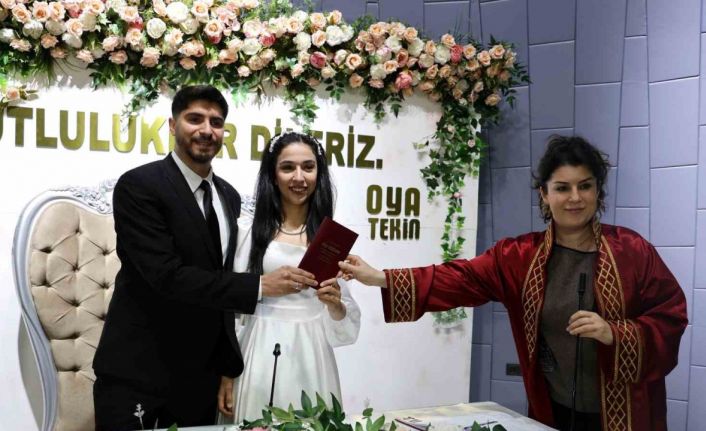 Nikah salonunda düzenlenen törenle dünya evine giren çiftler, 14 Şubat Sevgililer Günü’nde nikahlarını kıyarak çifte mutluluk yaşadıklarını ifade etti.