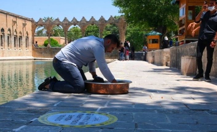 Adana’dan Şanlıurfa’ya gelen bir vatandaş, leğenini alıp Balıklıgöl’de çiğköfte yoğurdu. Vatandaşların şaşkın bakışları arasında çiğköfte yoğuran şahıs, ziyarete gelen turistlere ikram etti. Çiğköftenin tadına bakan turistler, hatıra fotoğrafı çektirdi.