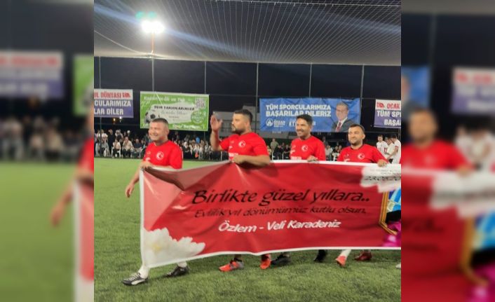 Adana’nın Kozan ilçesinde öğretmen olarak görev yapan Veli Karadeniz’in belediyenin düzenlediği turnuvadaki maçı evlilik yıl dönümüne denk geldi. Karadeniz, maçta sahaya takım arkadaşları ile "Birlikte evlilik yıl dönümüz kutlu olsun" yazılı pankartla çıktı. İki çocuk babası olan Karadeniz, eşine hazırladığı süprizle büyük alkış aldı.