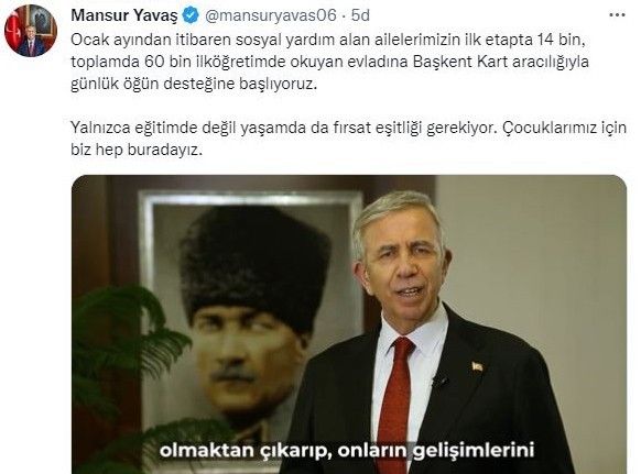“Her gün haberlerde okula aç giden ve okulda aç kalan çocuklarımızı üzülerek takip ediyoruz. Bunlardan en etkili olanı ise okullarda açlıktan dolayı ağlayan çocukların olduğu haberdi. Bu haberler bizlerin sorumluluğunu daha da artırıyor. Bu nedenle, sosyal yardım alan ailelerimizin çocukları için yılbaşından sonra ilk olarak pilot bölgelerde, ardından da tüm Ankara’da Başkent Kartla kantin alışverişi dönemini başlatıyoruz. Öğrenci başına aylık 330 lira destekte bulunarak evlatlarımızın beslenmeleri için kıymetli bir adım atmış olacağız. SMA testi, çocuk tarama testi, kreşler, doğal gaz desteği, et desteği, kırtasiye desteği, öğrenci abonmanı, öğrenci su indirimi, ücretsiz internet, barınma merkezleri, sınav ücreti ödemeleri, teknoloji merkezleri, bunların hepsi çocuklarımız için. En büyük projemiz, nesillerce süren yoksulluğu çocuklarımız için makus bir gelecek olmaktan çıkarıp, onların gelişimlerini ve eğitimlerini tamamlayarak aydınlık bir geleceğe sahip olmalıdır.”