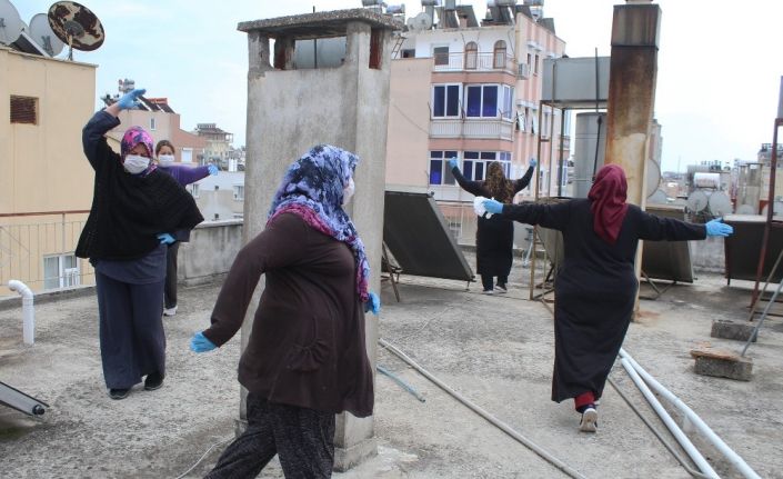 Yeni tip korona virüs (Kovid-19) tedbirleri kapsamında yapılan ‘evde kal’ uyarısının ardından ev hanımları gün ve toplantıları erteledi ama spordan taviz vermedi. Sportif faaliyetlerini evlerin terasına taşıyan kadınların damdaki spor faaliyetleri havadan da görüntülendi.