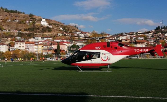 Tokat’ın Niksar ilçesinde sahaya ambulans helikopterin inişi sırasında futbolcular antrenmanı durdurdu.