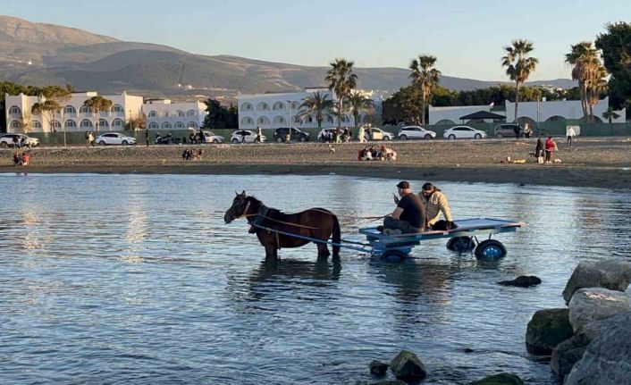 Hatay’da hafta sonu güneşli hava kendini hissettirdi. Ocak ayında güneşli havanın tadını çıkarmak isteyenler, Arsuz ilçesinde sahillere akın etti. Karaağaç mevkisinde güneşli havanın tadını çıkarmak isteyen 2 kafadar, at arabasıyla denize girdi. İlginç olayda üstleri ıslanmadan denizin ortasında keyif çatan 2 vatandaşın o anları kameraya yansıdı. Vatandaşların meraklı bakışları arasında denizin içinde at arabası üzerinde güneşlenen şahısların o anları hayrete düşürdü.