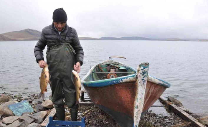 Karslı balıkçı Nurhak Yazar, günün erken saatlerinde açıldığı Aygır Gölü’nden tuttuğu balıklarla geçimini sağlıyor.