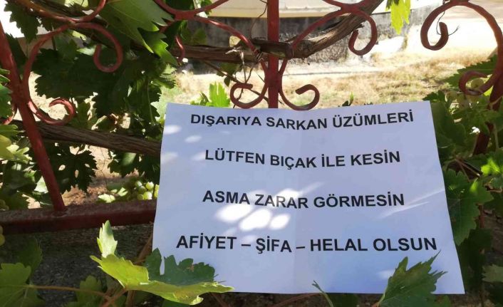Kahramanmaraş’ın Elbistan ilçesinde bir vatandaş, bahçesinden dışarı sarkan asmadaki üzümleri, yoldan geçenlerin rahatça yiyebilmesi için ‘Lütfen asmaları bıçak ile kesin, helal olsun’ yazılı bir not bıraktı.