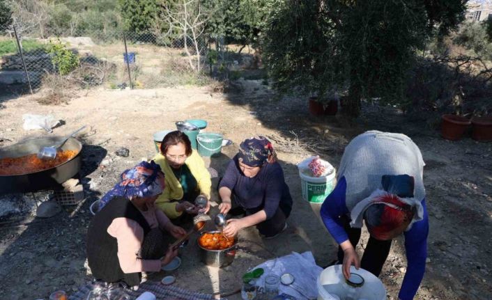 Adana’nın Kozan ilçesinde kadınlar, bahçede imece usulü kazanlarda kabak tatlısı yaptı.
