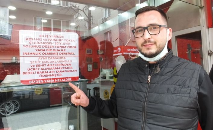 Balıkesir’in Burhaniye ilçesinde, köfte, kokoreç ve hamburger servisi yapan Hüseyin Emre Bertan, hayırlı bir kampanyaya imza attı. İsteyenin karnını bedava doyuran Bertan, şehit yakınlarından da para almıyor. Bertan’ın işyerinin camına astığı yazı da büyük ilgi gördü.