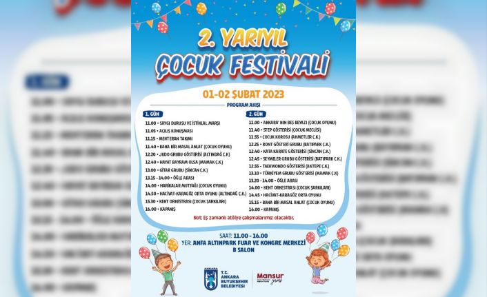 Ankara Büyükşehir Belediyesi (ABB) tarafından ikincisi düzenlenen Yarıyıl Çocuk Festivali başlıyor.