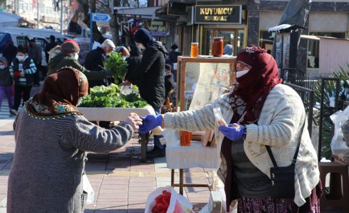Bazen sözün bittiği yerde bir kare fotoğraf her şeyi anlatır. İşte Amasya’nın Taşova ilçesinde pazar yerinde satış yapan kadının birlik ve beraberlik ruhunu yansıtan fotoğraf karesi.