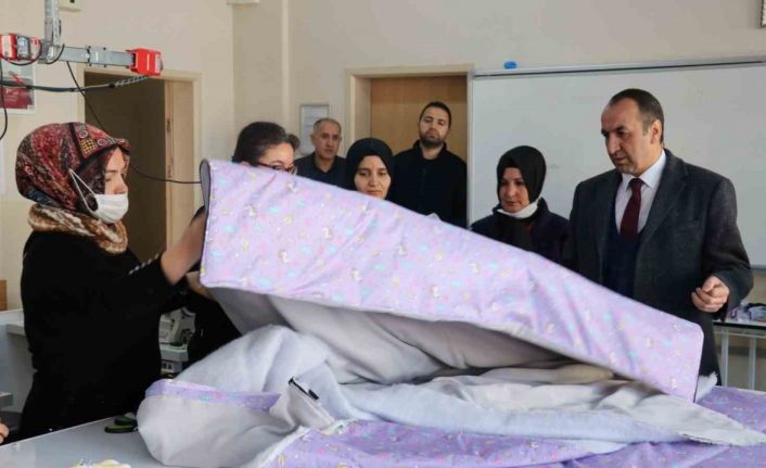 Yücel, “Öncelikle ülkemizin başı sağ olsun. Bakanlığımız ve valiliğimiz talimatları istikametinde deprem olduktan sonra İl Milli Eğitim Müdürlüğü olarak çalışmalarımıza başladık. Karşıya Mesleki ve Teknik Anadolu Lisesi’ndeyiz. Depremzede vatandaşlarımıza yönelik olarak uyku tulumu yapıyoruz. Günde yaklaşık 100 adet uyku tulumu yapmaktayız. Toplamda bittiğinde 800 uyku tulumunu göndereceğiz. Bunun devamı da gelecek. Burada önceliğimiz depremde zarar gören vatandaşlarımıza yardımcı olmak. Çocuklarımızı da unutmadık. Çocuklarımız bizim her şeyimiz. Onlara yönelik özel uyku tulumları yapıyoruz. İnşallah onların acılarını beraber paylaşıp, gidermeye çalışacağız. Burada öğretmenlerimiz, müdürlerimiz, usta öğreticilerimiz el birliği içerisinde hareket ediyor. İl Milli Eğitim Müdürlüğü olarak üzerimize düşen görevi yapmaya çalışıyoruz” dedi.