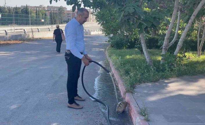 Adıyaman Üniversitesi kampüs alanında ise bir kaplumbağanın susuzluk ve sıcaklar nedeniyle yürümekte güçlük çektiğini fark eden görevli kaplumbağayı hortumla su tutarak serinletti.