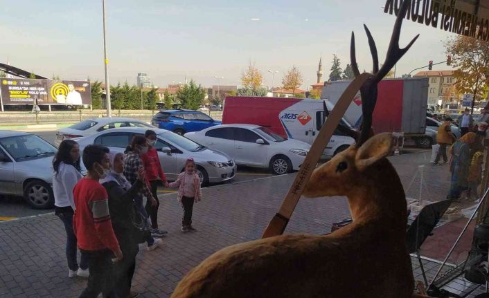 Bursa’da av malzemeleri satan dükkâna gelen vatandaşları geyikler ve çitalar karşılıyor.