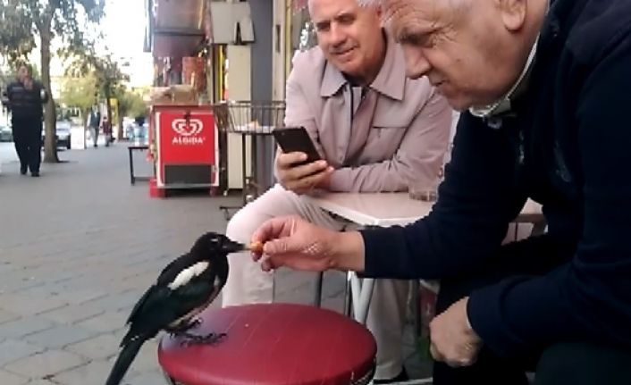 Bursa’da döner tiryakisi saksağan, görenleri hayretler içinde bırakıyor. Sevimli saksağan, dönerci dükkânına gelen müşterilerin üzerine konarak, kendine döner ısmarlatana kadar ayrılmıyor.