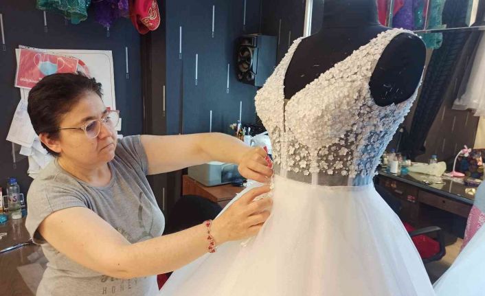 “Modellerimiz arasında A Kesim, Helen gibi gelinlik modellerinin yanı sıra, istedikleri modellerin fotoğraflarını bize getirerek özel dikimde yaptırabiliyor. Fiyatlar kış ile yaz arasında fark ediyor. Örneğin kışın 3 bin-3 bin 500 lira olan bir gelinlik modeli, yazın 4 bin ile 6 bine, hatta 10 bine kadar çıkabiliyor. Prenses, A Kesim, Helen modellerinin yanı sıra taşlı modellerimiz çok ilgi görüyor. Kır düğünü düşünen çiftlerimiz ise papatya modeli tercih ederken, döneme uygun olaraktan dikimlerimiz yapıyoruz. Yoğunluk tahminim ekim sonuna kadar devam eder. Çünkü havalar soğudukça düğünler azalıyor.”