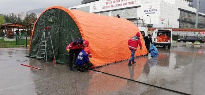 BURSA (İHA) – Bursa Yüksek İhtisas Eğitim ve Araştırma Hastanesinin bahçesine acil müdahale çadırları kuruldu.