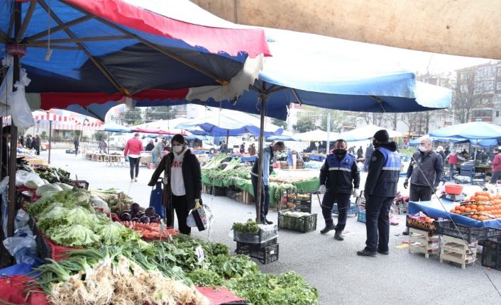Nilüfer Belediyesi Zabıta Müdürlüğü ekipleri, Korona virüs salgınının yayılmasını önlemek amacıyla pazarlarda aralıksız denetimde. Salgın riskine karşı denetime çıkan ekipler, tezgahların 3 metre kuralına uygun olmasını sağlarken, vatandaşları da ürünlere dokunmamaları konusunda uyarıyor.