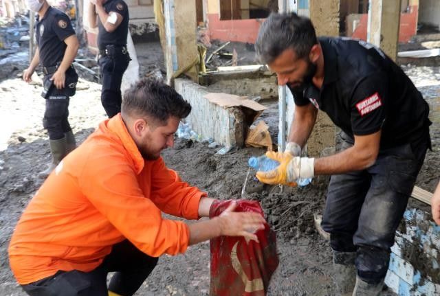 Kastamonu’da yaşanan selde arama ve kurtarma çalışmalarına katılan DAKE ekipleri ve Göksel Aksu isimli vatandaş çamur içerisinde buldukları Türk Bayrağı’nı yıkayarak en yüksek yere astılar.