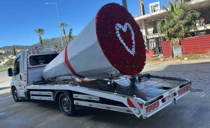 Antalya’nın Gazipaşa ilçesinde 14 Şubat Sevgililer Günü dolayısıyla çekicisinin vincini 777 gülle donatılmış buket haline getiren