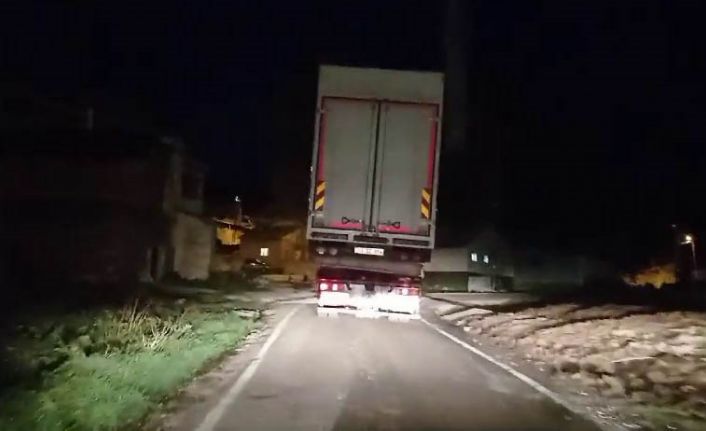 Dün akşam saatlerinde dar yoldan geçen kamyon yüklü çekici, yolda seyreden vatandaşlara korku dolu anlar yaşattı. Sağlıklı olmayan yolda güçlükle ilerleyebilen çekici, cep telefonu ile görüntülendi.