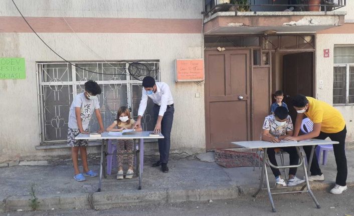 Osmaniye’nin Kadirli ilçesinde yaşayan İngilizce öğretmeni Cemil Coşkun, hafta sonları yaşadığı sokağa masa ve sandalye atıp mahallenin tüm çocuklarına ders çalıştırıyor.