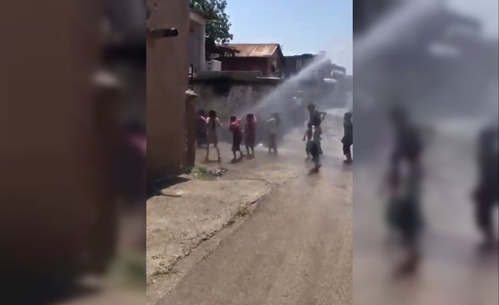Hava sıcaklığının mevsim normallerinin üzerinde seyrettiği Adana’da sıcaktan bunalan çocuklar, belediye arazözünden sıkılan tazyikli suyla serinledi.