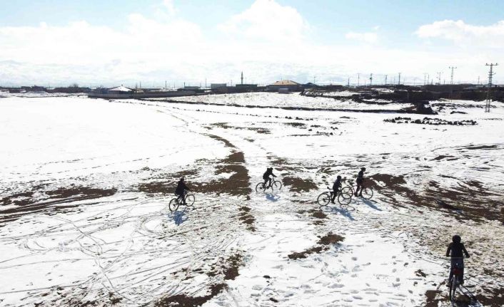 Ağrı’nın Doğubayazıt ilçesine bağlı Karaca köyünde yaşayan çocuklar, kar üzerinde bisiklet sürüp balon uçurdu.