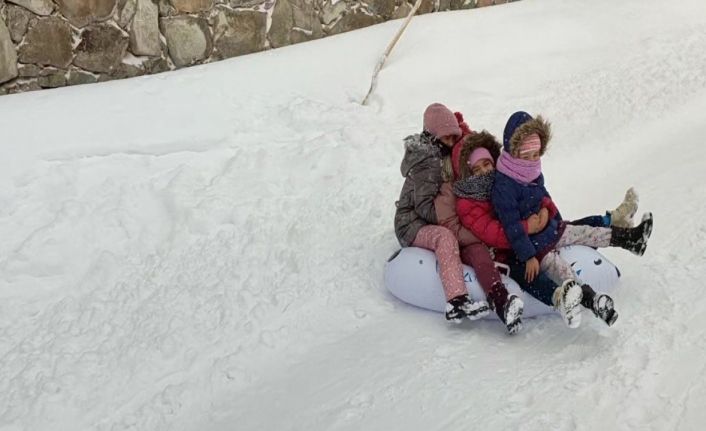 Sivas’ın Kızılelma köyünde vatandaşlar ile çocukların şişme bot ve kızaklarla kayak yapması renkli görüntüler oluşturdu.