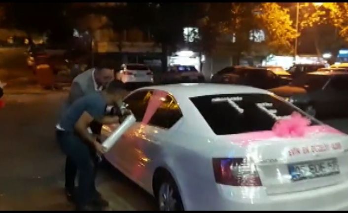 Kahramanmaraş’ta dünya evine giren çiftin düğün arabası arkadaşları tarafından streç film ile kaplandı.