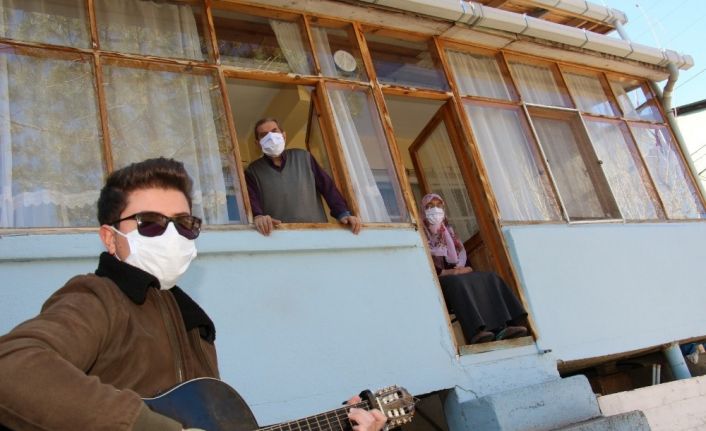Erzurum’da bir genç, korona virüs nedeniyle evden çıkamayan dedesi ve anneannesine moral vermek için pencere kenarında mini konser verdi.