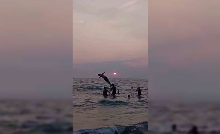 Hatay’da bir grup genç, denizde suyun içine kurdukları merdivenin üzerinden atlayarak doyasıya eğlendi.