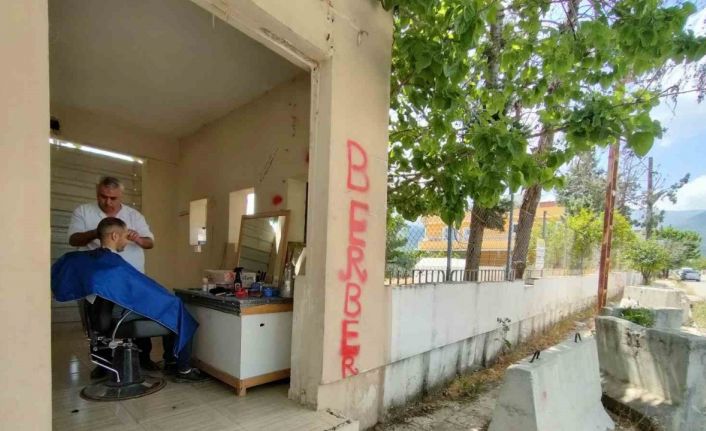 6 Şubat Kahramanmaraş merkezli depremlerde en fazla yıkım Hatay’da yaşandı. Kent merkezi kadar ilçelerin de ağır hasar aldığı depremde vatandaşlar, devletin yardımlarının yanında kendi imkanlarıyla da hayata tutunmaya çalışıyor. Hassa ilçesinde 33 yıldır berberlik yapan 46 yaşındaki Sedat Çay’ın iş yeri de depremde ağır hasar alarak yıkıldı. Doğup büyüdüğü toprakları terketmeyen Çay, kendini toparladıktan sonra müşterilerinin isteği üzerine çadırlara ve evlerin bahçelerine tıraşa gitti. Yeni iş yeri için de başvuru yapan Çay, mahallesinden bir süre önce taşınan polis merkezinin nöbet kulübesinin ayakta olduğunu gördü. Aklına burayı iş yeri yapmak gelen Çay, temizlik ve bakımın ardından koltuğu ve malzemelerini kulübeye getirdi. Çay, kapısı, elektriği ve suyu olmasa da müşterilerinin ihtiyaçlarını burada gidermenin mutluluğunu yaşıyor. Tabela olarak ise kulübenin duvarına sprey boya ile ’berber’ yazıldığı görüldü.