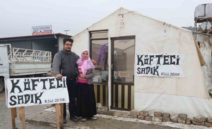 Hatay’da yaşayan 16 yıllık çift Sadık Kodalak ve Şükran Kodalak, ailesiyle birlikte depremde kaldıkları çadırı iş yerine dönüştürüp köftecilik yaparak hayata tutunuyor.