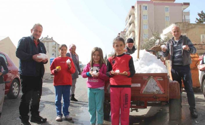 Kahramanmaraş’ta depremzede çocukların ’kar dede’ dediği Mustafa Uludağ, Ahır Dağı’ndan getirdiği karlarla çocukların yüzünü güldürdü.