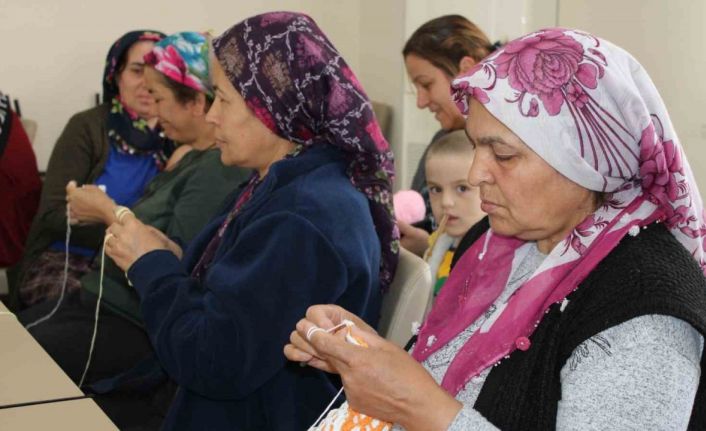 Kahramanmaraş depremlerinin ardından Aydın’daki Güzelhisar Öğrenci Yurdu’na yerleştirilen depremzede kadınlar, açılan örgü kursunda hem el emeğiyle hazırladıkları ürünlerini ilmek ilmek örüyor, hem de stres atıyor.