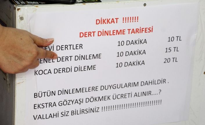Antalya’da 10 yıldır iş yerine gelenlerin derdini dinlemekten yorulan 3 çocuk annesi esnaf Arife Bircan, bu şikayetini astığı bir tepki yazısıyla dile getirdi. Ticari amacı olmadan mesaj vermek amacıyla "Dikkat dert tarifesi" ismiyle asılan yazıda dertlerin 10 dakikalık dinleme karşılığının 15 TL olduğu mesajını verdi. Derde göre değişen tarifede en çok dinlediği dert olan koca derdinin 10 dakikalık tarifesini 20 TL olarak uyguladı.