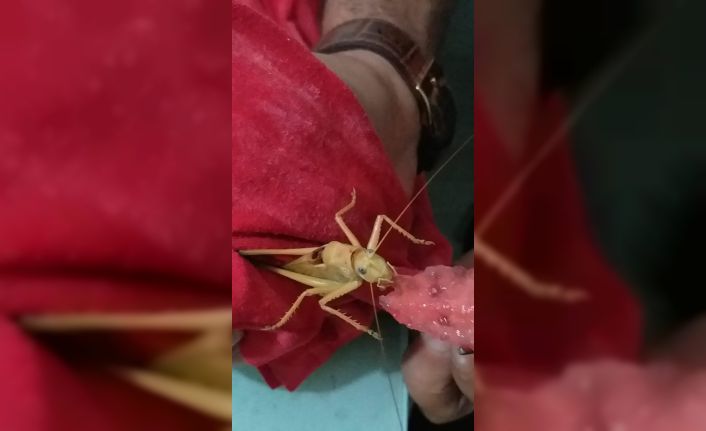 Elazığ’da bir vatandaş, yanına gelen dev çekirgeye karpuz yedirdi.