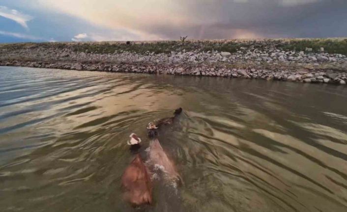 Diyarbakır Devegeçidi Barajında kaydedilen görüntüler izleyenleri hem şaşırttı hem gülümsetti. Sıcak havadan bunalan üç büyükbaş hayvanın baraj göletinde serinlediği anlar, dron kamerasına yansıdı. Aynı bölgede otlayan koyun sürüsü de deponun sesi ve hareketinden ürkerek panikle kaçmaya başladı. Koyunların telaşla dağılması renkli ve ilginç görüntüler ortaya çıkardı.