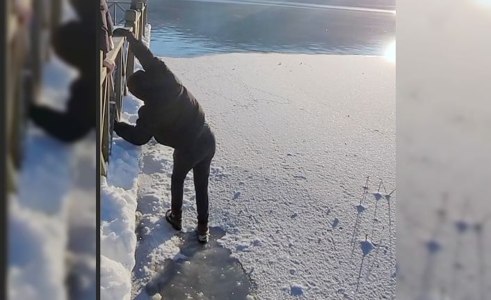 Donmuş gölde buz kırıldı, suya düşmekten son anda kurtuldu