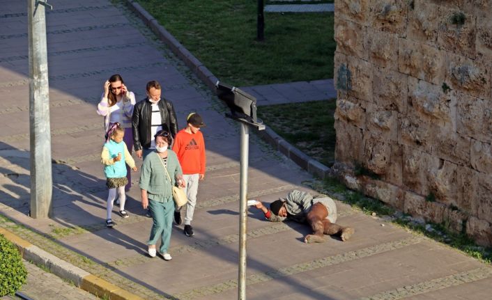 Turizm kenti Antalya’nın en işlek caddelerinde yaklaşık 4 yıldır dilenen S.K. isimli dilenci, geçtiğimiz yıl topladığı ve çok sayıda dövizin bulunduğu paralarını bir markette sayarken cep telefonu kamerasına yansımıştı. Bacağındaki şişlik ve yaralarla kambur şekilde yürüyerek dilenen S.K., dün ise kentin en turistik bölgelerinden Kaleiçi’nde yerde yatıp dilenirken görüntülendi. S.K.’yı gören vatandaşlar ile turistlerin, yakın geçmemek için yolunu değiştirdiği gözlemlenirken, bazılarının ise S.K.’ya para verdiği görüldü.